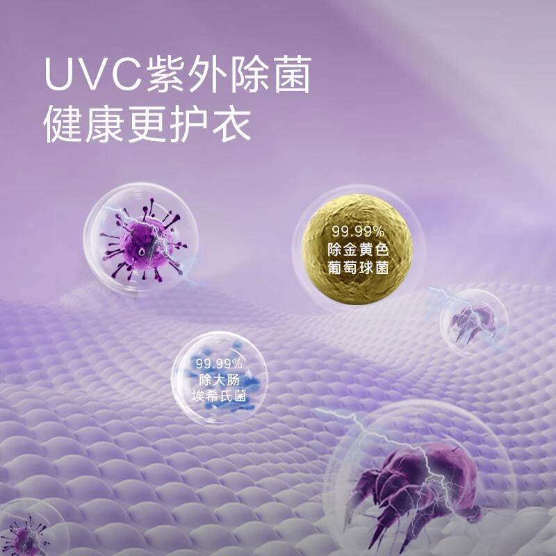 紫外线除菌:运用先进的紫外线技术,有效杀灭衣物上的细菌,为您和家人提供更安全卫生的洗涤选择,尤其呵护儿童衣物。